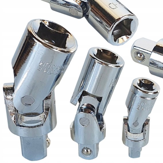 Zestaw przegubów Cardana udarowych kulistych. Przeguby są przydatne wszędzie tam, gdzie dostęp konwencjonalnymi narzędziami jest utrudniony lub niemożliwy. Przeznaczone do stosowania z narzędziami udarowymi. Wykonane z stali chromowo-molibdenowej.