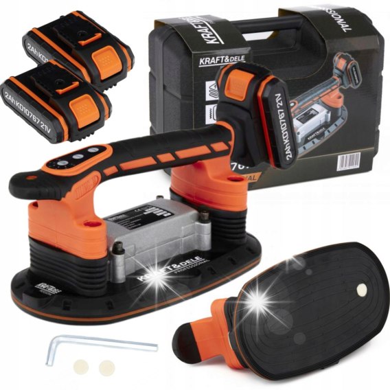- Bezprzewodowa przyssawka wibrująca do układania płytek polskiej marki Kraft&Dele model KD10767. Umożliwia łatwe ustawienie płytek poprzez przyssawkę, z możliwością podniesienia obiektów o wadze do 150 kg. Dodatkowo, dzięki funkcji wibracji, usuwa ona resztkowe pęcherzyki powietrza, które mogą prowadzić do potencjalnych pęknięć, zapewniając tym samym solidne i trwałe połączenie płytki z podłożem.
