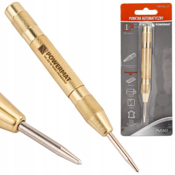 Automatyczny punktak Powermat umożliwia szybkie i precyzyjne zaznaczanie punktów na metalu, drewnie i tworzywach sztucznych przed wierceniem. Wewnętrzny mechanizm sprężynowy z hartowaną iglicą eliminuje potrzebę użycia młotka, zapobiega ślizganiu się wiertła i zapewnia wysoką dokładność. Solidna konstrukcja gwarantuje wygodną, bezpieczną i efektywną pracę w warsztacie oraz przemyśle.
