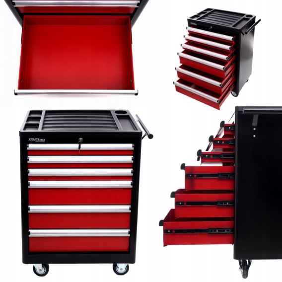 Szafka jest w wyposażona w 3 mniejsze szuflady na drobne narzędzia oraz 3 pojemne dolne szuflady na większe narzędzia.