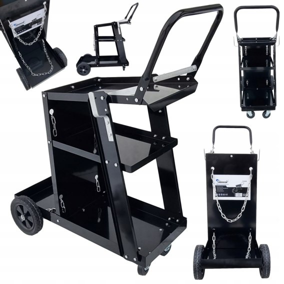 - Stabilny wózek spawalniczy o wytrzymałej stalowej konstrukcji firmy ONDRAGON ► Może być używany ze wszystkim spawarkami MMA, MIG, TIG. Przy spawaniu z butlą nie musimy jej ręcznie przenosić. Dodatkowe półki pomieszczą potrzebne podczas pracy akcesoria, tak aby były zawsze pod ręką. ► Maksymalny obciążenie do 65kg, pozwala transportować nawet cięższe spawarki wraz z osprzętem. ► Górna półka przeznaczona dla spawarki, dwie pozostałe o dużej pojemności na akcesoria. Z tyłu wózka znajduje się półka na butle wraz z dwoma łańcuchami dla jej stabilizacji ► Wózek wyposażony w 4 gumowane koła ułatwiające transport. Przednie koła - obrotowe, zapewniające łatwe manewrowanie wózkiem. ► Doskonale sprawdzi się w każdym warsztacie zawodowego jak i niedzielnego spawacza. ► Posiada rączkę wygięta pod kątem dla wygonego prowadzenia.