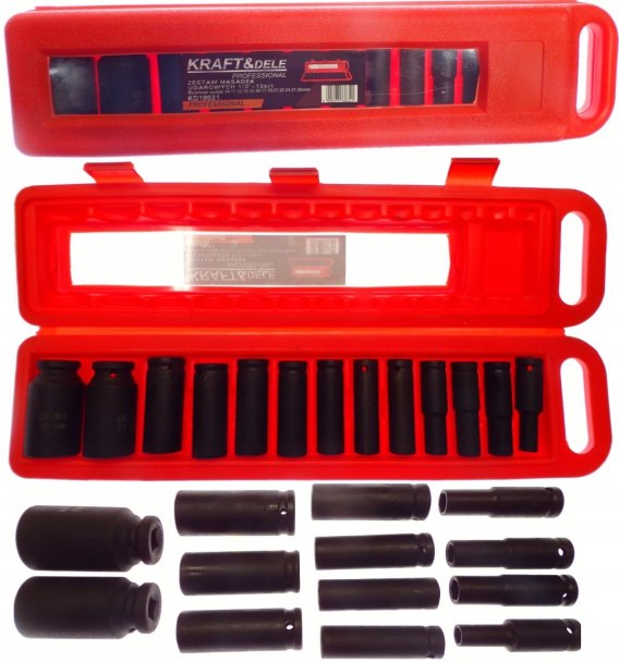 Zestaw bardzo solidnych nasadek udarowych od firmy KRAFT&DELE ze stali CRV.