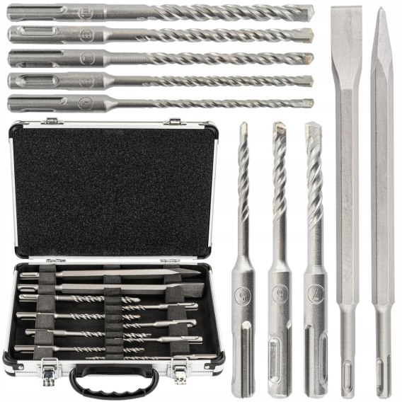 Zestaw zawiera 10 elementów: 8 wierteł SDS Plus o różnych średnicach oraz 2 dłuta – szpicak i płaskie.