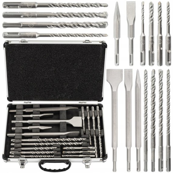 W komplecie jest 17 elementów: 12 wierteł SDS-PLUS oraz 5 dłut o różnych kształtach i rozmiarach.