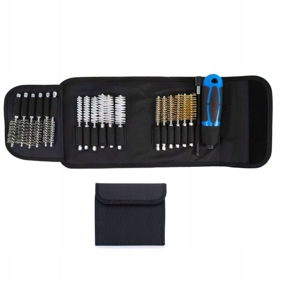☑️ 20 sztuk: 6 szczotek stalowych, 6 szczotek mosiężnych, 6 silikonowych szczotek nylonowych, 1 przedłużka, 1 uchwyt. Wszystko mieści się w torbie transportowej ułatwiającej transport i identyfikację.