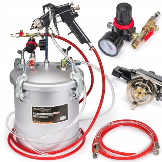 Zestaw posiada 8 l zbiornik wykonany z aluminium, na pokrywie którego mocowany jest reduktor ciśnienia, z manometrem i zaworem bezpieczeństwa. Do pistoletu lakierniczego farba podawana jest pod ciśnieniem i tam rozpylana jest przy pomocy sprężonego powietrza. Ciśnieniowy agregat malarski idealnie sprawdzi się przy malowaniu dużych powierzchni i nie tylko.