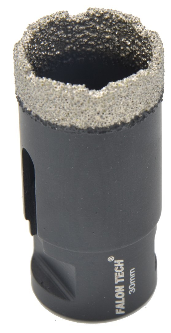 Diament w otwornicach FALONTECH FT30M14 osadzony jest metodą lutowania próżniowego. Oznacza to, że drobiny diamentu zatopione są w materiale. Nie są to otwornice pokryte diamentem tylko z wierzchu. Dzięki temu koronki FALONTECH odznaczają się ogromną żywotnością, a także są odporne na wysoką temperaturę - można nimi pracować na wysokich obrotach szlifierki, na sucho.
