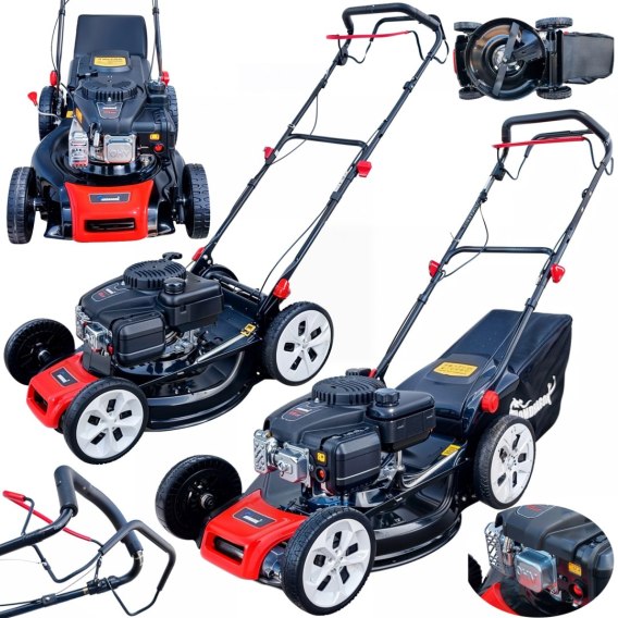 Nowoczesna kosiarka przeznaczona do ogrodu, na działkę. Zasilane silnikiem benzynowym o mocy 9KW.
