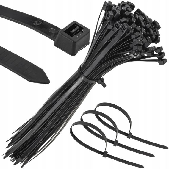 Opaski zaciskowe 7.6 x 450 mm, w kolorze czarnym, pakowane po 100 szt. Przeznaczone są do łączenia wiązek kabli elektrycznych, przewodów, rurek, węży lub też do szybkich doraźnych naprawach. Proste w montażu. Posiadają dużą odporność na zrywanie. Dostępne są w wielu rozmiarach oraz kolorach. Gęste ząbki na całej długości pozwalają na precyzyjne dopasowanie pętli opaski do rozmiaru wiązki. Opaski możemy zaciskać ręcznie lub za pomocą specjalnego przyrządu.