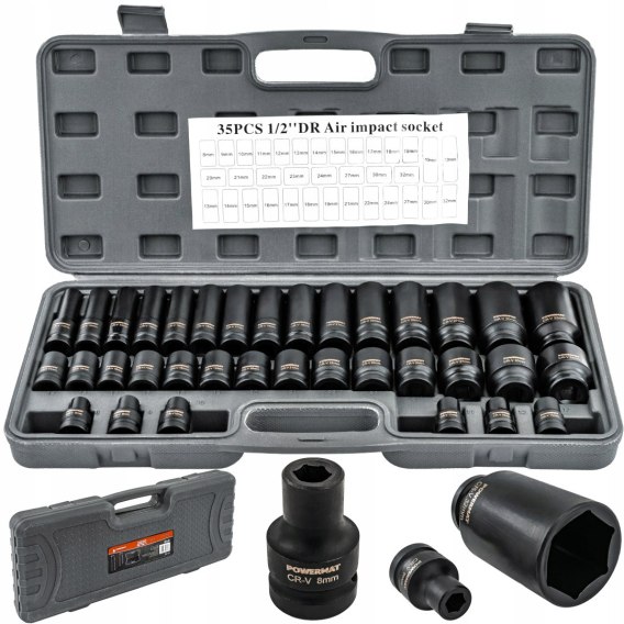 Otrzymujesz 35 sztuk nasadek HEX w zakresie 8–32 mm z gniazdem 1/2", gotowych do pracy z kluczem udarowym. Stal Cr-V i dwie długości 38 mm oraz 78 mm dają trwałość i elastyczność w codziennej pracy.