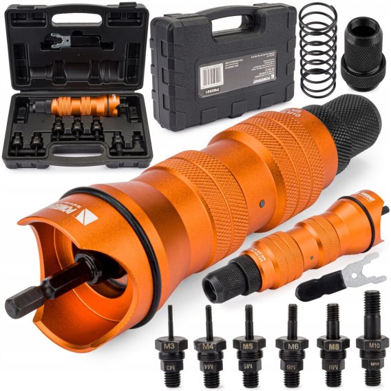 Dzięki temu urządzeniu w niesamowicie łatwy i szybki sposób wykonasz mocowania za pomocą nitonakrętek. Nitownica na wkrętarkę / wiertarkę w całości wykonana jest ze stali - wyjątkowo solidna konstrukcja. Całość umieszczona jest w plastikowej walizce. Adapter pasuje do każdej standardowej wkrętarki lub wiertarki.