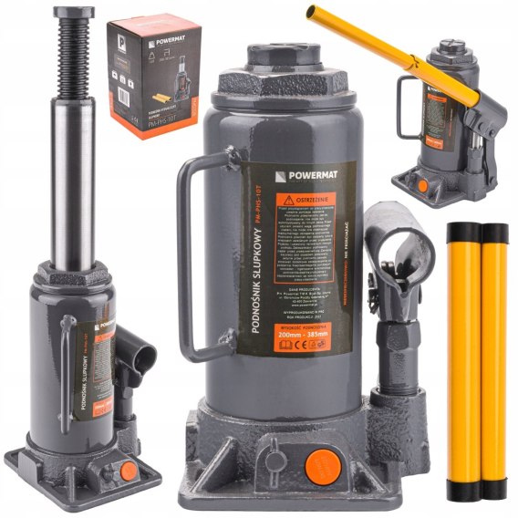Wytrzymały i bezpieczny podnośnik hydrauliczny Powermat to idealne rozwiązanie do garażu i warsztatu. Solidna stalowa konstrukcja, stabilna podstawa i zawór bezpieczeństwa zapewniają niezawodność. Zakres podnoszenia 200-385 mm umożliwia precyzyjną regulację, a kompaktowy rozmiar ułatwia przechowywanie.