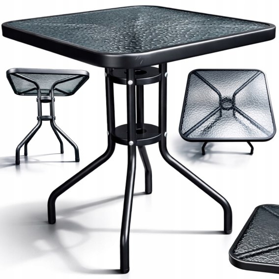 Praktyczny stolik do ogrodu, na taras czy balkon -Blat stołu wykonany z wytrzymałego szkła hartowanego na wzór falującej wody -Profile stalowe malowane proszkowo -Blat bez otworu -Nadaje się do użytku na zewnątrz i wewnątrz -Łatwy montaż -Rozmiar blatu: 60x60 cm -Wysokość: 70 cm