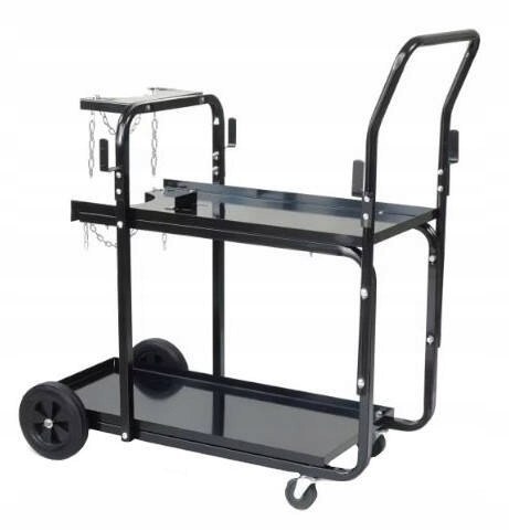 Większe kółka z tyłu a mniejsze z przodu dają nam łatwość manewrowów. Dwie półki i półka na butlę wraz z łańcuchami mocującymi, które zapewniają stabilność butli. Wyposażony w 4 haki do podwieszania na uchwyty spawalnicze czy węże ułatwiające pracę spawacza.