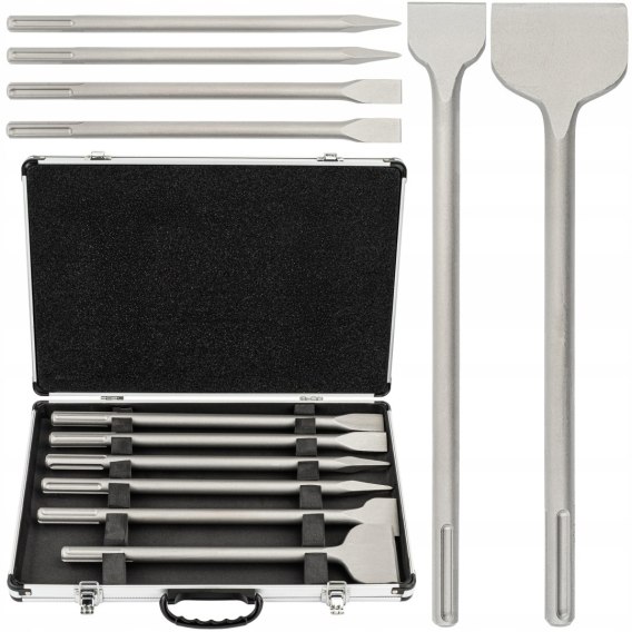Zestaw obejmuje dłuta płaskie 25x400 mm (2 szt.), 50x400 mm, 80x360 mm oraz szpicaki 18x400 mm (2 szt.). Łącznie otrzymujesz 6 elementów.