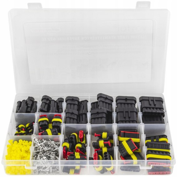 Zestaw składający się 622 złączek hermetycznych w 6 rozmiarach pasujących do najbardziej popularnych średnic przewodów elektrycznych. Stosowane w branży motoryzacyjnej, m.in. do czujników i urządzeń w samochodach. Zapewniają bardzo dobrą izolację i szczelność. Dostępne rozmiary: 1-6-pinowe złącza typu „superserseal” wyposażone z gumowe uszczelnienia gwarantują odporność na płyny hamulcowe, oleje i paliwa opakowanie z przegródkami
